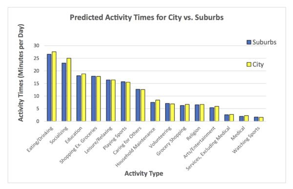 This chart, which comes from an extensive U.S. time-use study in 2019, shows little difference in what people do in suburbs vs. cities, even with an outdoor activity like playing sports. You asked about media, and that’s not exactly captured, although the categories of watching sports and leisure/relaxing are closely related.